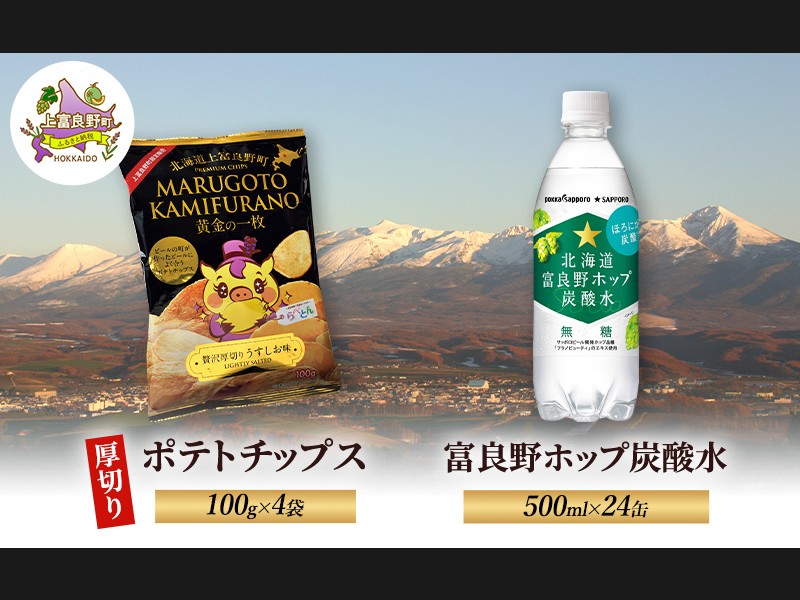 北海道 上富良野 ポテトチップス 100g 4袋 富良野 ホップ炭酸水 500ml × 2...