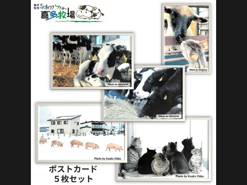喜多牧場の動物たちの写真が印刷されたポストカード5枚を特製の封筒に入れてお届けします。 喜多牧場でしか見られない紋別の風景をご自...