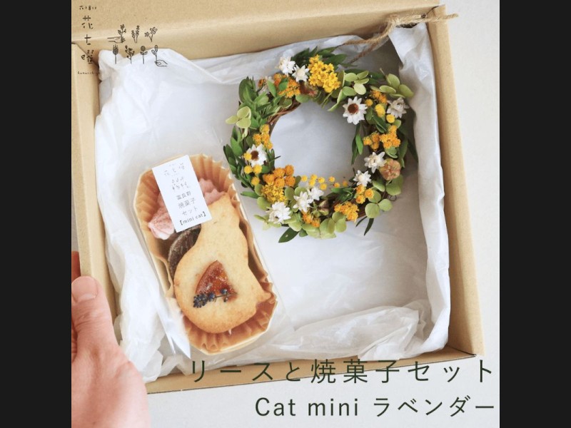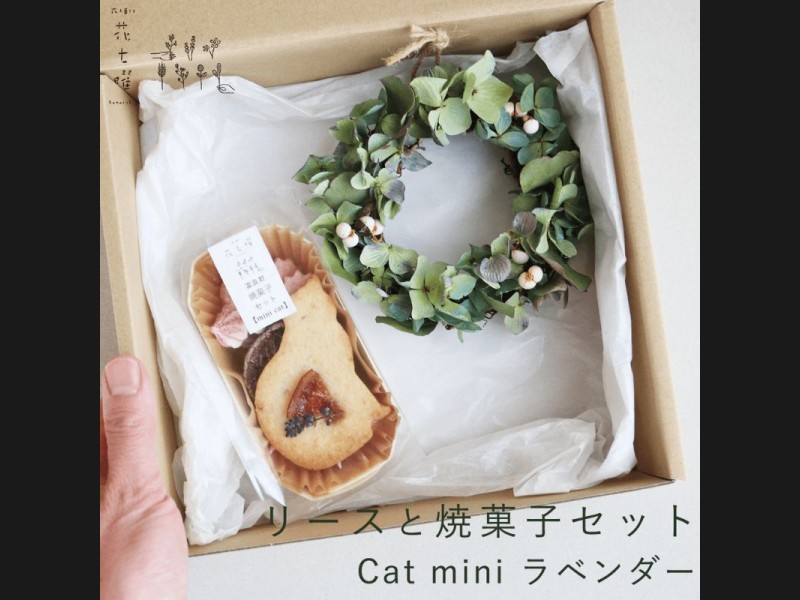 富良野花七曜がお届けする、カラーが選べるセミオーダーリースとねこクッキーがかわいいこだわり素材の焼菓子のセットです。 まずは...