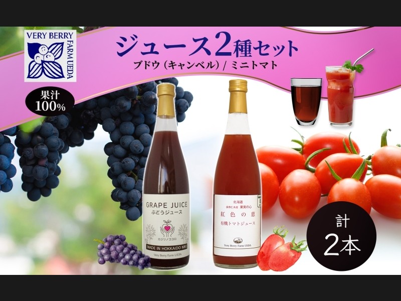北海道の農園で、人の手で丁寧に有機栽培されたミニトマトとブドウ(キャンベル)のジュースをセットにしました。 ジュースは水や砂...