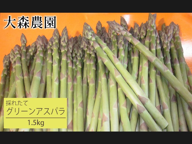 北海道仁木町の大森農園より「グリーンアスパラ」をお届けいたします。 当日収穫のアスパラより、Mサイズ以上を1.5kgご用意して発送...