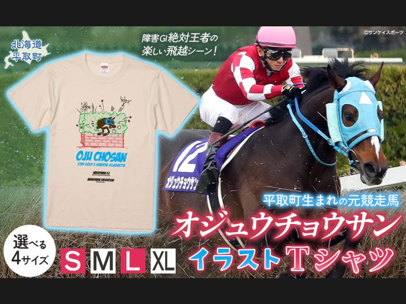 【返礼品の説明】 障害レース界の絶対王者「オジュウチョウサン」が豪快に飛越する姿がイラストになったデザインTシャツは、上質な5....