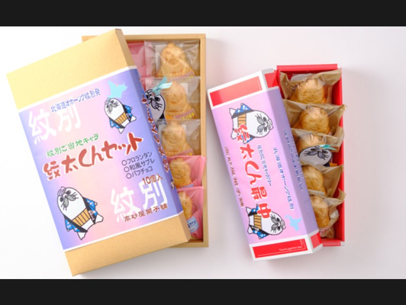 オホーツク産もち米を使った「紋太くん」をモチーフにした最中種に小豆餡を詰めた最中の詰め合わせと、洋風最中(チョコ・フロランタン...