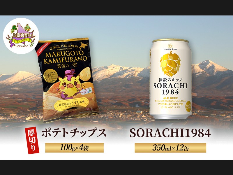 上富良野町の人気返礼品のビール「SORACHI 1984」と特産品の厚切りポテトチップスをお届けします。 ■吉澤商店/ビール「SORACHI 1984...