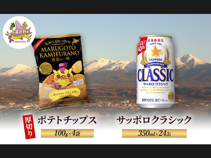 上富良野町の人気返礼品のビール「サッポロクラシック」と特産品の厚切りポテトチップスをお届けします。 ■リカーショップかまだ/ビ...