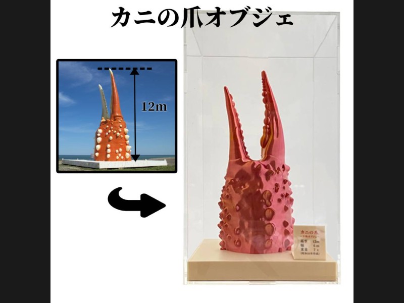 紋別市のシンボルとして注目されている「カニの爪」オブジェ、高さ12m、幅6m、重さ7tの巨大モニュメントのミニチュアを3Dプリンターで...