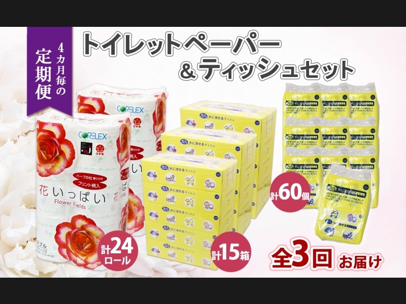 【 4ヶ月毎全3回お届け定期便】 さわやかな香り付き 花いっぱいトイレットペーパーと 水に流せるとけまるくん ボックスティッシュ・...