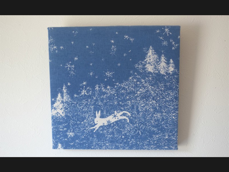 雪の上を駆け回るうさぎを染めました。 シルクスクリーンの手捺染で染めた生地をファブリックパネルに仕立て、パネルもサイズに合わせ...