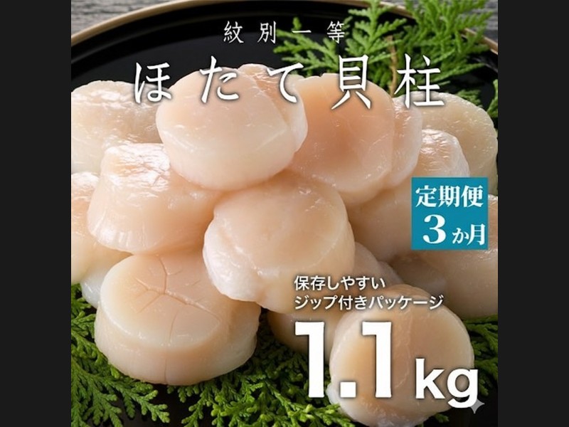 90-30 【定期便3か月】紋別一等~冷凍帆立貝柱1.1kg×1パック×3回