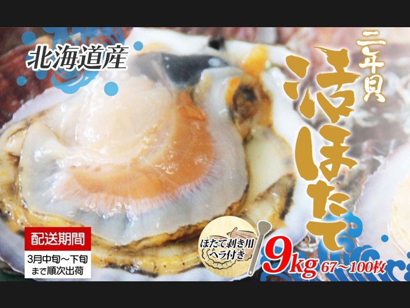 北海道産 活ほたて 2年貝 約 9kg 67枚~100枚 2026年3月中旬~3月下旬頃お...