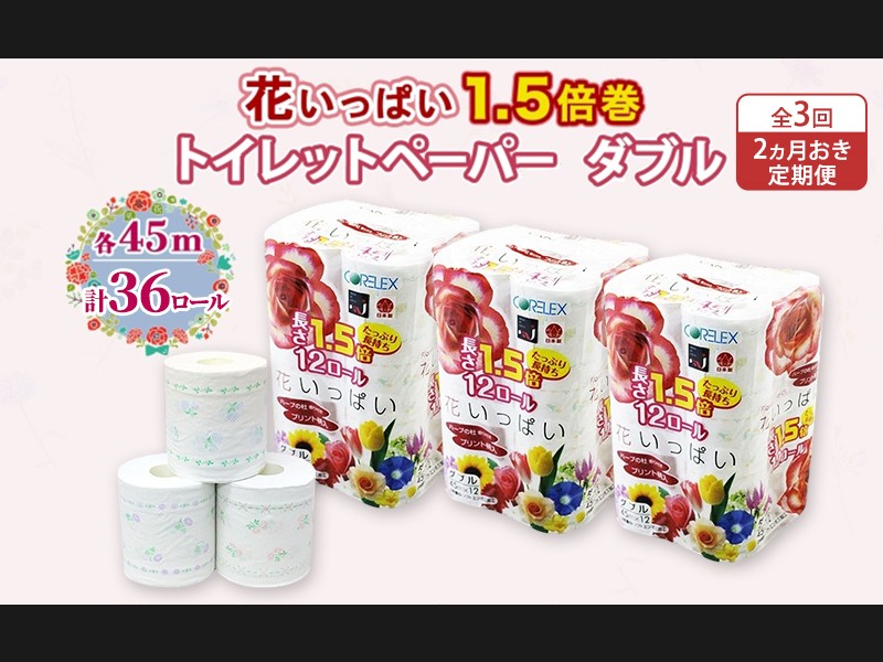 定期便 全3回 長持ち 1.5倍巻き 花いっぱい トイレットペーパー ダブル 45...